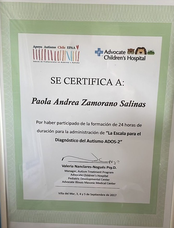 Debido al interés en contribuir al proceso de evaluación diagnóstica, la FLGA.PAOLA ZAMORANO aplica la Entrevista para el Diagnóstico de Autismo, ADI-R, junto Escala de Observación para el Diagnóstico de Autismo (ADOS 2), para entregar una apreciación más certera considerando el desempeño del propio usuario como de sus antecedentes.